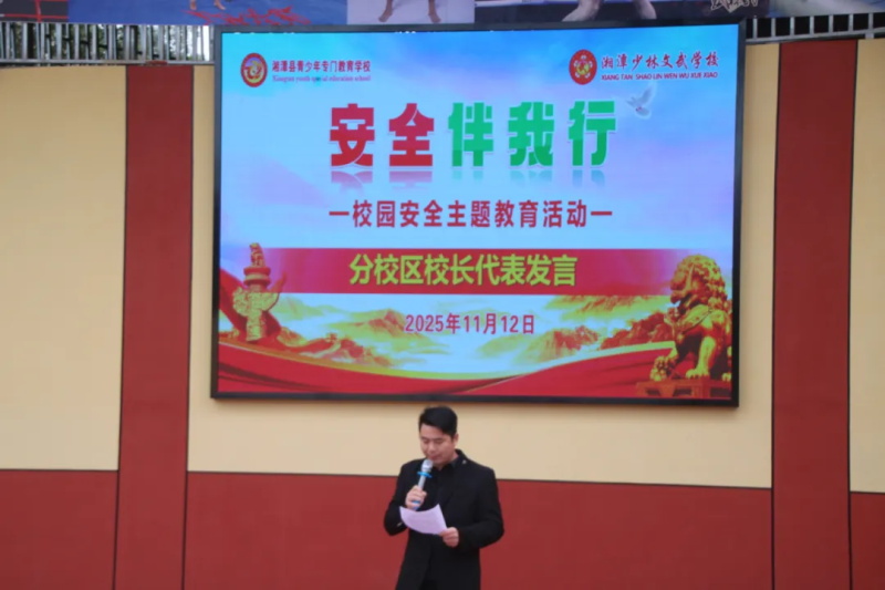 分校区何校长作为代表登台发言,以生活场景切入:“安全藏在晨雾中平安到校的脚步里,藏在晚霞中顺利归家的身影里。”他驳斥“安全离我们很远”的误区,指出课间慢行、遵守红绿灯、拒绝陌生信息等细微举动,都是安全“筑墙”的关键。
